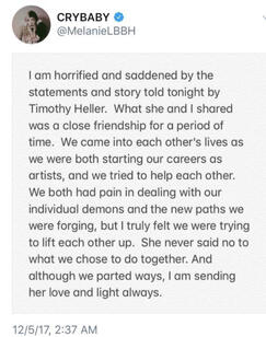 -- ( unsure if melanie saw this, but many others did )december 5, 2017 melanie had denied the allegations, expressing shock and sadness, claiming that heller "never said no to what we chose to do together"december 9, 2017 melanie had issued a second, extended response. thanking fans for analyzing timelines and past social media posts, and stating she "would never be intimate with someone without their absolute consent"