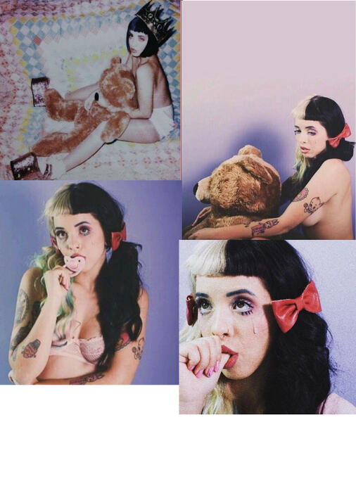 melanie martinez faced accusations of ageplay after fans and online users uncovered old tumblr posts in which she appeared to fully expose her chest while portraying her fictional character "crybaby." this portrayal, which blended childlike themes with adult imagery, raised concerns about the intentional blurring of boundaries between innocence and sexuality.further allegations emerged during the crybaby era, likely following the album’s release, when melanie participated in photoshoots that featured provocative and controversial imagery. in some photos, she is seen hugging a teddy bear with her chest exposed, while in others, she is depicted sucking on a pacifier and placing a finger in her mouth in a way that many felt deviated from a playful or innocent tone. these instances contributed to ongoing criticism that her aesthetic romanticized or sexualized childlike visuals.