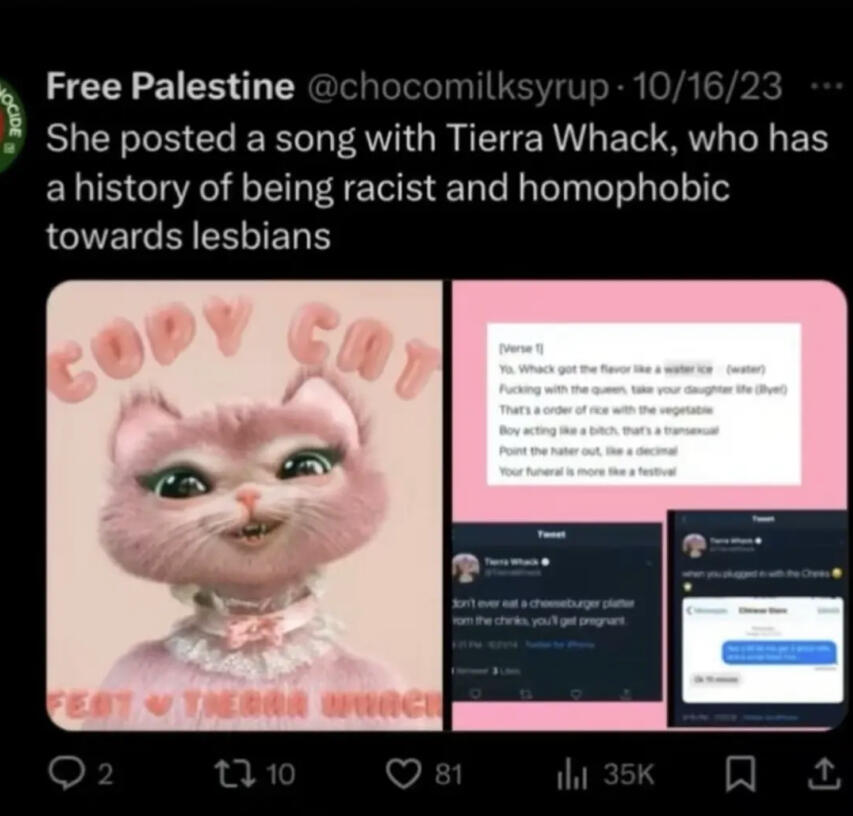 following the release of k-12, melanie martinez entered a new phase of her career, which included her first ever musical collaboration, with artist tierra whack. while the collaboration initially garnered excitement, it quickly sparked controversy among fans after resurfaced content revealed that tierra whack had allegedly made several offensive remarks in the past, including racist and homophobic slurs specifically directed at lesbians.this discovery led to widespread criticism, with many fans questioning the decision to work with an artist who had a history of making such inflammatory statements. given melanie’s long standing image of supporting marginalized communities, particularly within the lgbtq+ space, the collaboration struck some as contradictory or disappointing. others speculated whether melanie was even aware of tierra’s past behavior before agreeing to collaborate, as no public statement was made addressing the controversy.despite the lack of clarity, the partnership raised concerns about accountability and awareness in creative partnerships. for many fans, it reignited ongoing discussions about the importance of vetting collaborators especially when an artist brands themselves as socially conscious and inclusive.